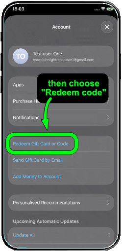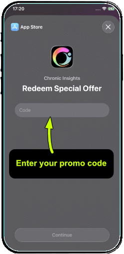 The easiest way to redeem a promo code is from the Premium Subscription settings page inside the Chronic Insights app. Tap on the ‘Redeem promo code‘ button near the bottom (if you don’t see this, try Method 2 below). This will open the App Store where you can enter your promo code.