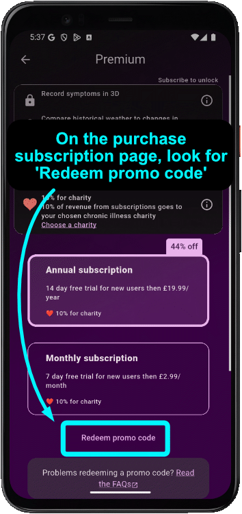 If you have received a promo code, these can be used to unlock an extended free trial for an annual subscription. If you have been given a hyperlink, simply tap the link on your phone - this will open the app store where you can redeem your promo code for an annual subscription. Alternatively, follow the steps here to redeem a promo code manually.