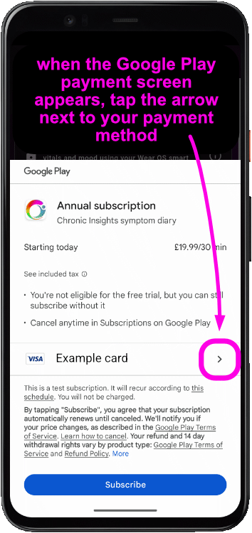 If methods 1 and 2 don’t work, tap on the Annual subscription option in the Chronic Insights Premium settings page. When the Google Play payment screen appears, tap the arrow next to your payment method, then choose “Redeem code“